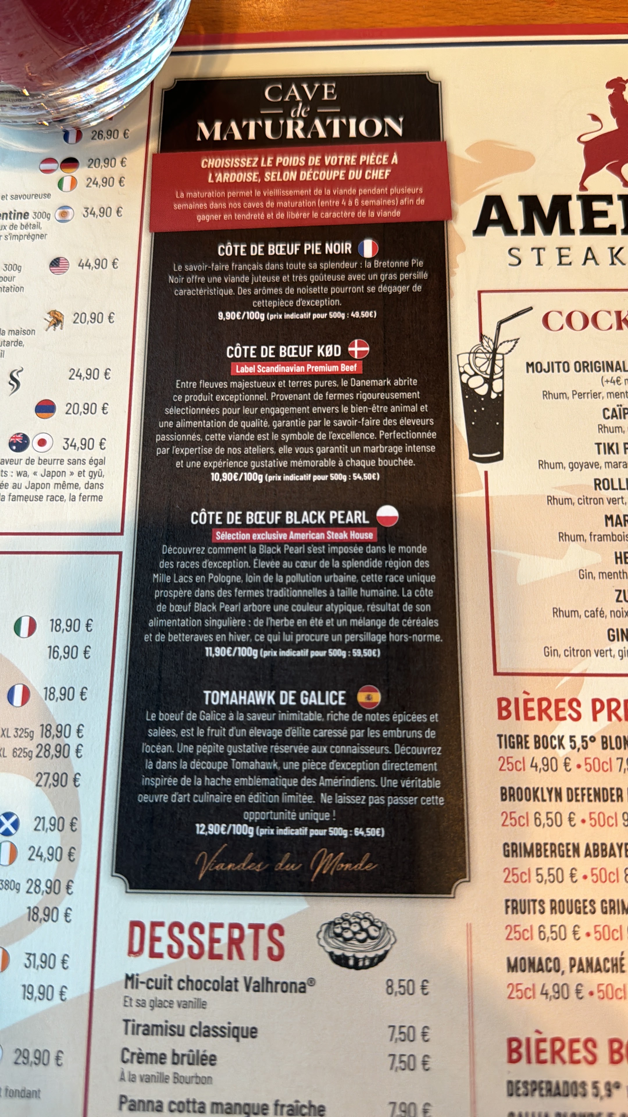 Cher Maxime, Merci pour cet avis détaillé qui nous permet de nous améliorer chaque jour. Même si nous trouvons que vous y allez un peu fort dans vos propos ("arnaque", "malhonnête"), nous tenons sincèrement à nous excuser pour ce moment passé chez nous qui n'a pas été à la hauteur de vos attentes. Pour rappel, nous ne forçons personne à rien chez nous. Il y a un choix de plus de 30 viandes à la carte pour tous les budgets, et des viandes maturées à partir de 400g pour ceux qui veulent se faire plaisir. La spécificité de la côte Tomahawk fait que c'est une pièce lourde, qui dépasse généralement le kilogramme et qui est faite pour être partagée. De plus, le bœuf de Galice a cette particularité d'être une viande reconnue non pas pour sa tendreté mais plutôt pour son goût intense et son marbrage espacé mais dense. Et en effet, pour éviter toute surprise, nous présentons toujours la viande avant cuisson afin que vous puissiez vous faire une idée et changer de pièce si elle ne vous plaît pas. Il semblerait que ce soir-là il y ait eu une mauvaise compréhension de notre part concernant votre mécontentement. Sinon, nous vous aurions changé de plat sans réfléchir, car tout le monde avait l'air satisfait à votre table et nous vous avons offert notre tournée de cafés et digestifs pour continuer la soirée dans la bonne humeur. Nous faisons notre maximum tous les jours afin de satisfaire nos obligations, mais en tout état de cause, vous êtes sorti non satisfait de notre restaurant, ce qui nous chagrine beaucoup. Nous vous demandons de ne pas rester sur cette note négative et vous invitons à nous donner une seconde chance. Nous ferons le nécessaire pour rattraper la situation et vous faire un geste afin que vous ne vous sentiez pas lésé. Maxime, appelez-nous et rattrapons cela. L'équipe de l'American Steak House :)