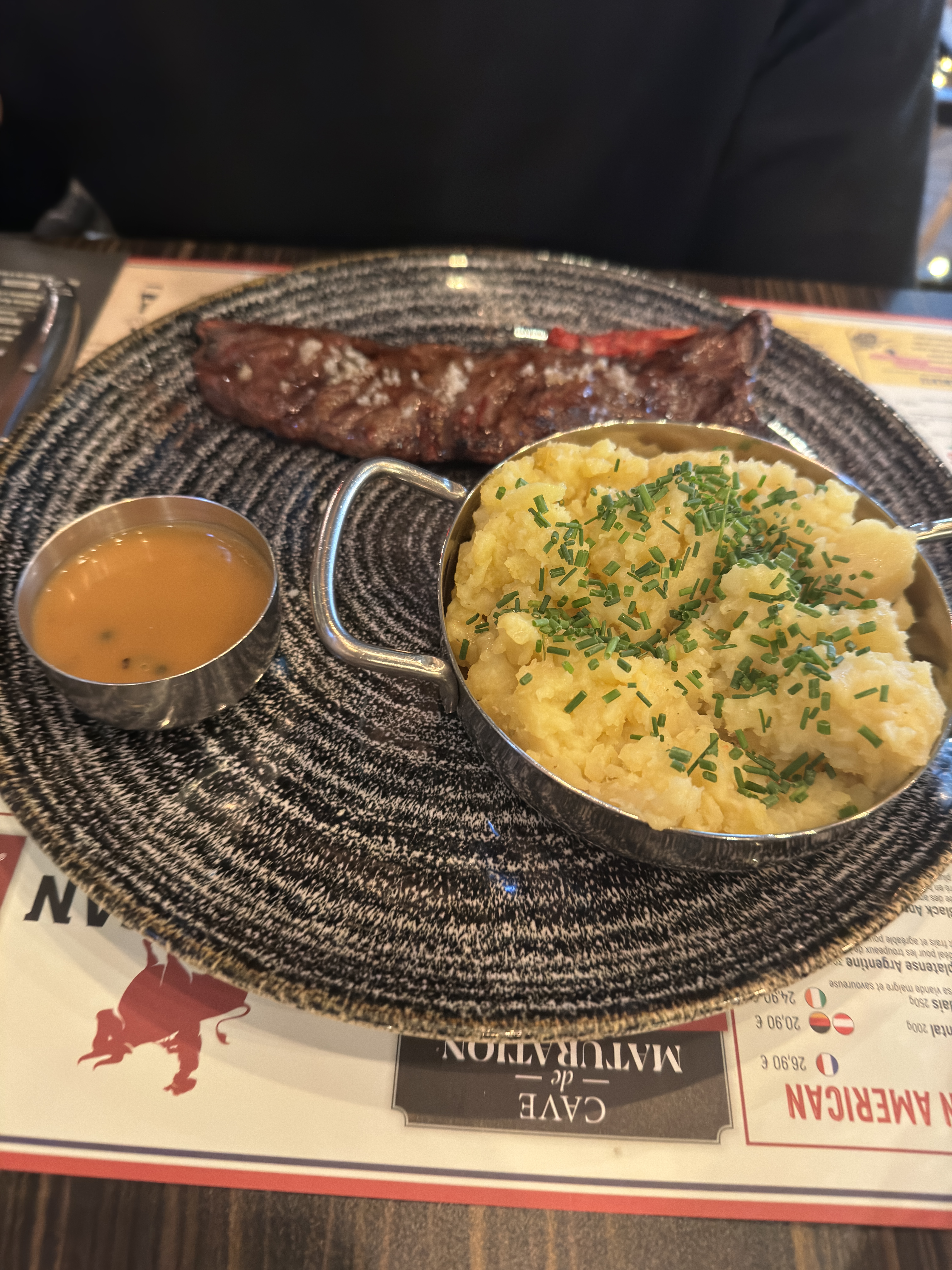 Super cadre à la déco américaine, j'adore, et très bon accueil et service (donne de très bons conseils). Un bon choix de viandes au menu et pour toutes les bourses. Au vu de la bonne qualité proposée, je trouve que le rapport au prix est plus que très correct. Perso j'ai pris un burger et il était juste excellent, la viande cuite à souhait et épaisse, je me suis régalée, avec en plus un bon choix dans les accompagnements, Max & cheese (manquait un peu de fromage mais très bon), frites, frites de patates douces, roquette parmesan, poêlée de légumes et écrasé de pdt. Par contre, les desserts étaient moyens mais on y va pour la viande qui est leur spécialité et on peut y aller les yeux fermés.