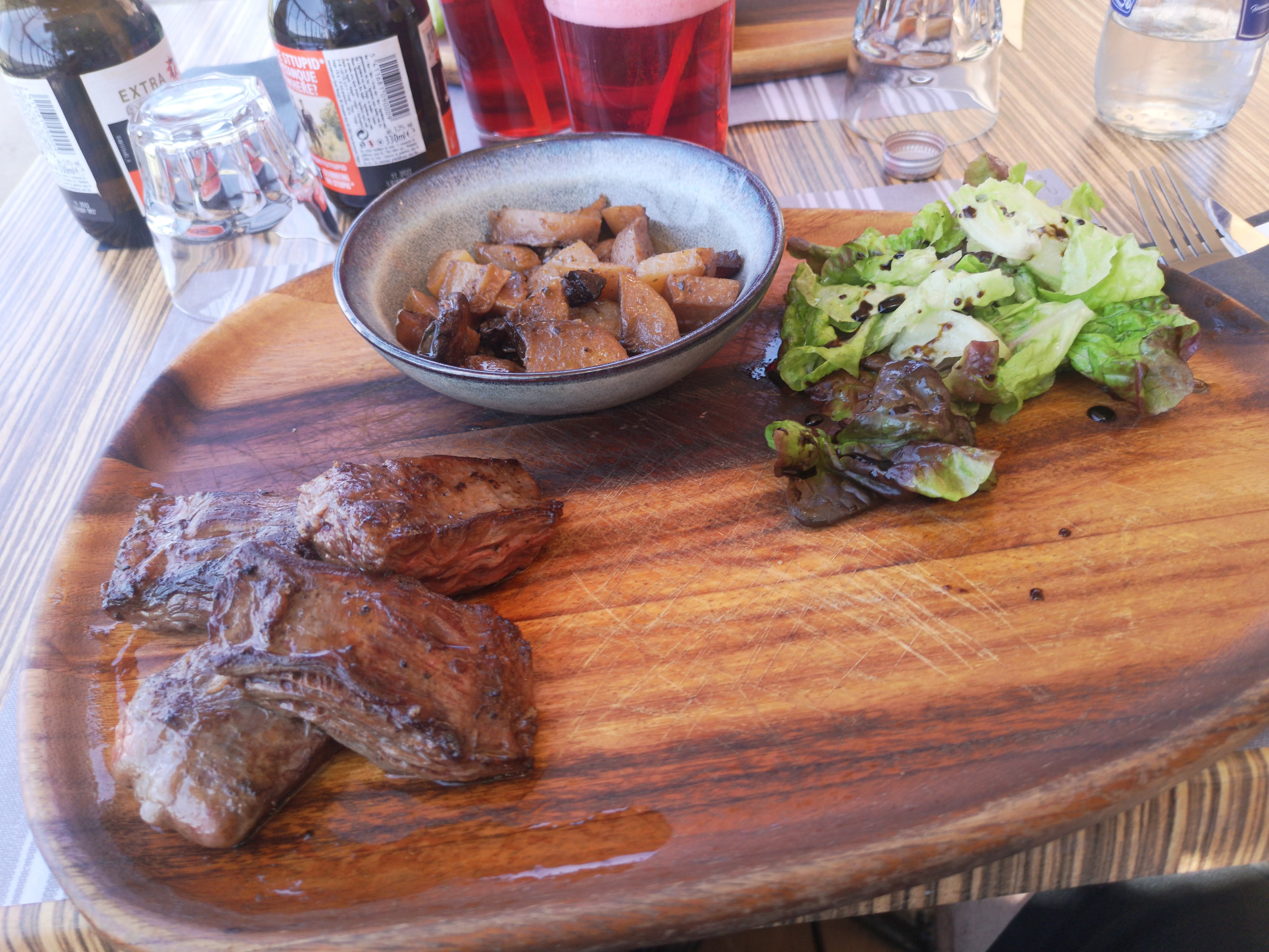 Vous avez malheureusement dut tomber sur un mauvais morceau, ou alors la cuisson n’étais peut être pas adapter.. si vous avez demander du à point ou bien cuit il est normal que la viande sont plus dure que d’habitude. Malgré tout si il s’agissait vraiment de la viande vous auriez du nous en faire part dès la première bouchée nous vous l’aurions changer sans problèmes. S’agissant de l’ombre si vous êtes venu un soir, le premier atout du restaurant reste la vue et son coucher de soleil, le soleil n’étant pas en hauteur les parasols ne servent à rien. Merci