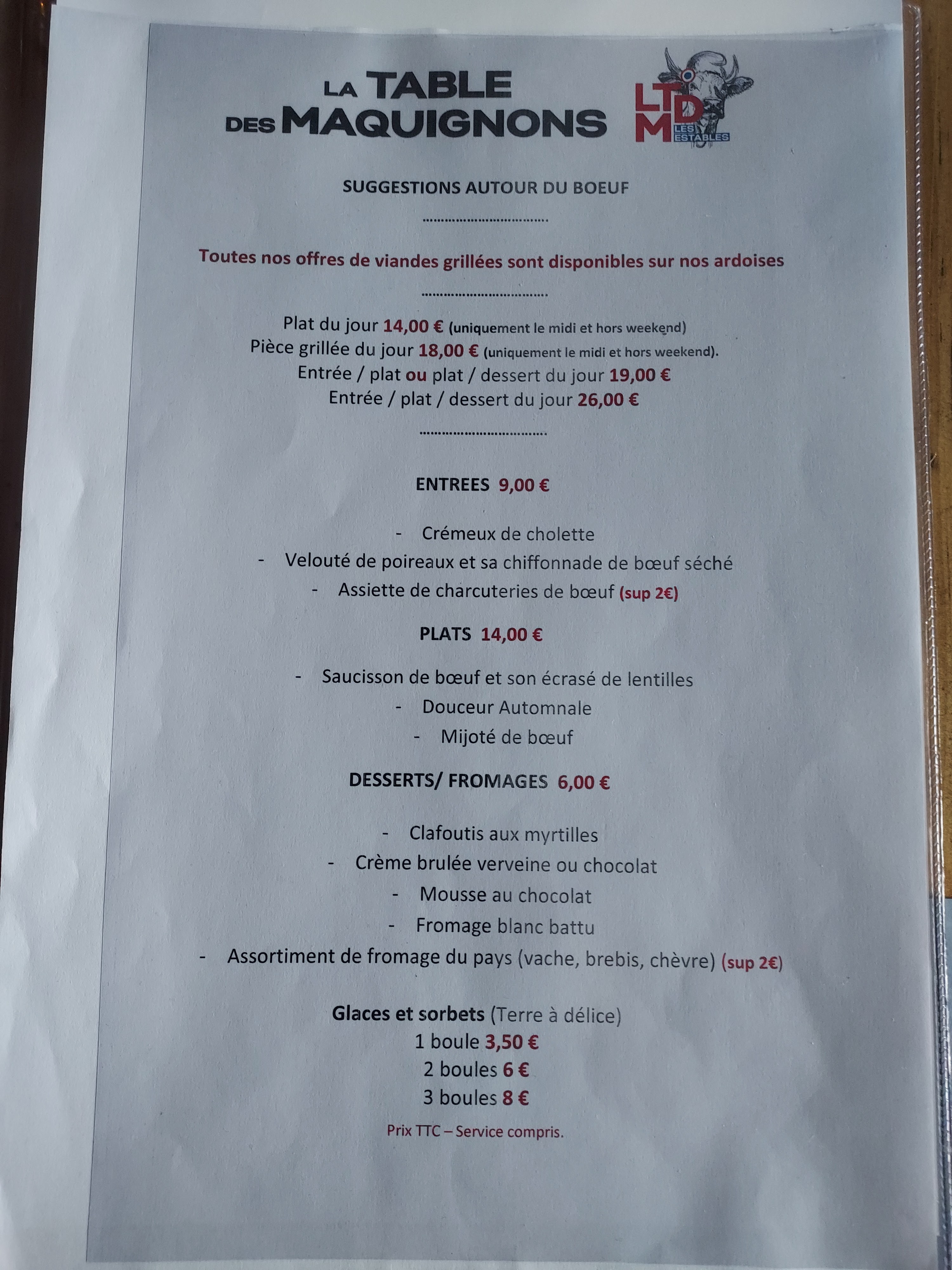 Nous avons diné 2 fois à la Table des Maquignons lors de notre séjour dans la région. Pas d'hésitation si vous aimez la viande. Le service est rapide et très pro, une jeune équipe, le lieu est super sympa et impeccable. Honnêtement nous sommes de grands amateurs de viande et j'ose le dire c'est une des toutes meilleures cote de bœuf que nous avons dégusté à cette table. La viande est en circuit ultra-court et on voit la différence !!! L'ouverture du resto est récente bravo et félicitations continuez sur votre lancée. Franck & Sophie
