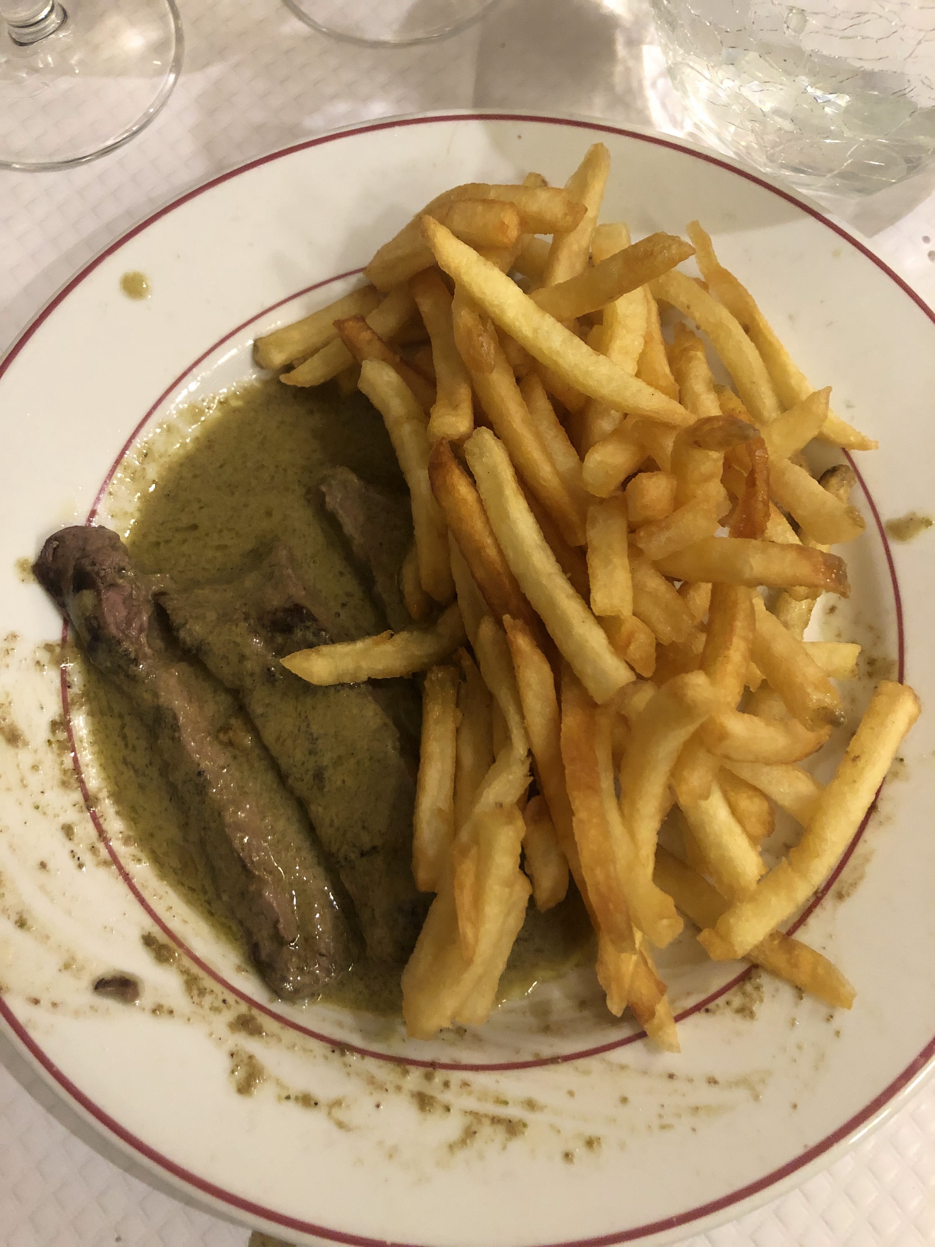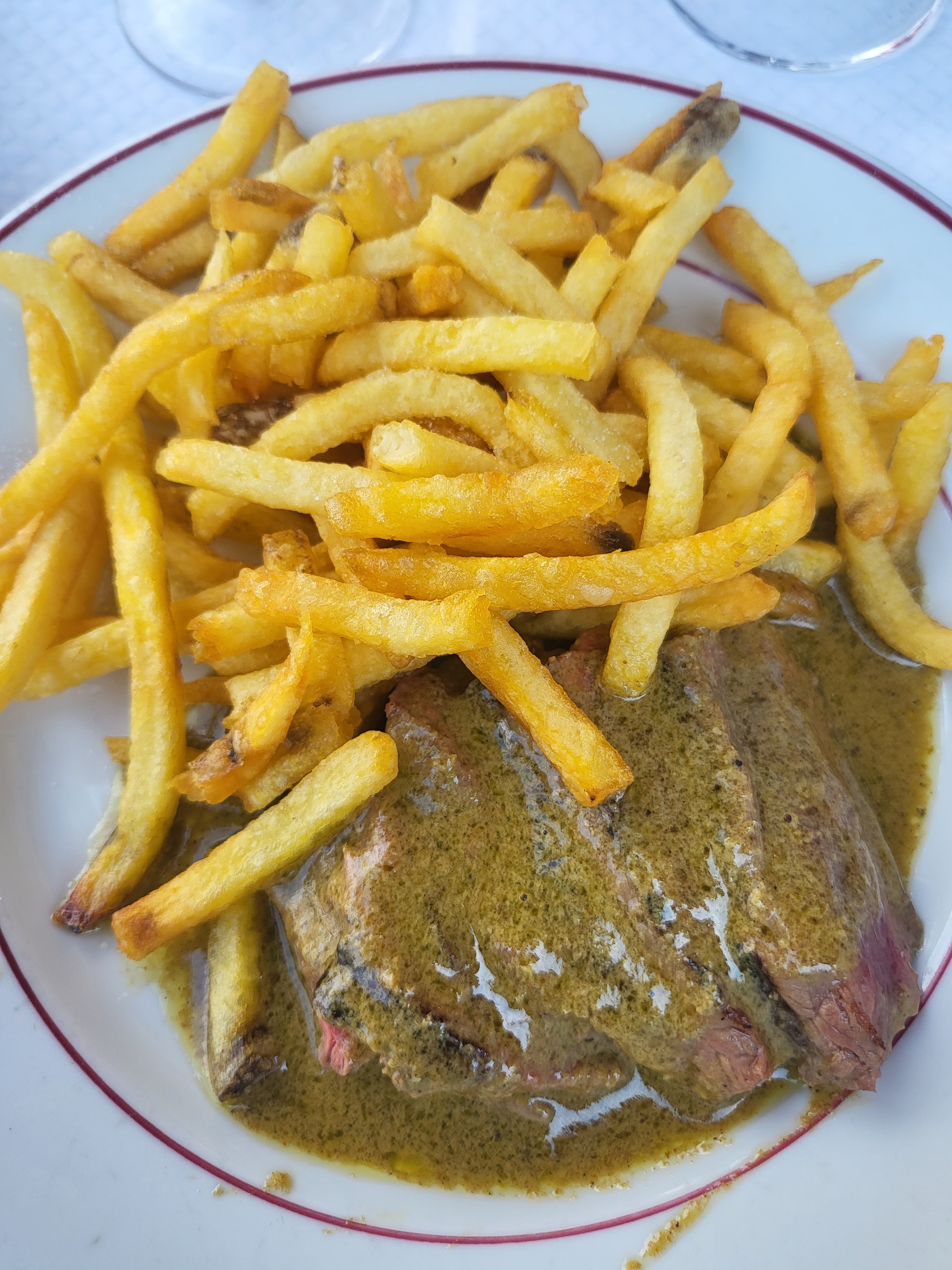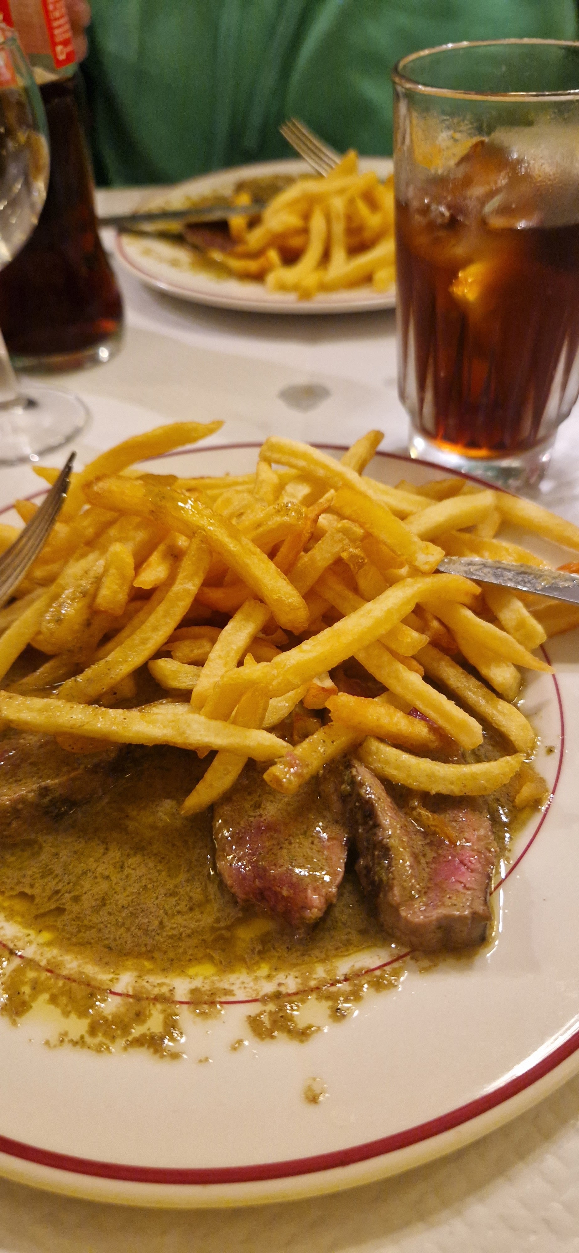 Ok, c'est pittoresque dans le concept. Maintenant, si vous venez pour un entrecôte, bah, passez votre chemin. La qualité de la viande est plutôt bonne mais il s'agit au mieux de filet mais plus sûrement de faux-filet. Donc déçu par l'offre qui ne correspond pas à la promesse. La sauce est à la hauteur de la réputation. L'idée d'avoir du rab est rassurante car le plat est finalement servi en deux fois, ce qui garantit d'avoir une viande toujours chaude. Ne préférez pas une cuisson saignante à une cuisson bleue par crainte d'un plat refroidi, vous serez resservi. Et heureusement, car la portion initiale de viande est plutôt réduite. Mais au final, en quantité, c'est correct, sans plus. En revanche, c'est frites à volonté... Ou presque, car avec l'affluence du midi en semaine, on sent qu'on doit rapidement laisser la place. Et pourtant, elles sont pas mal, ces frites, même si très fines. Au final, une expérience en demi-teinte, avec une promesse fièrement proclamée mais qui n'est pas tenue : une ENTRECOTE !!! Côté ambiance, cela dépendra de vos voisins de table, car la promiscuité est de mise, mais c'est dans le concept.