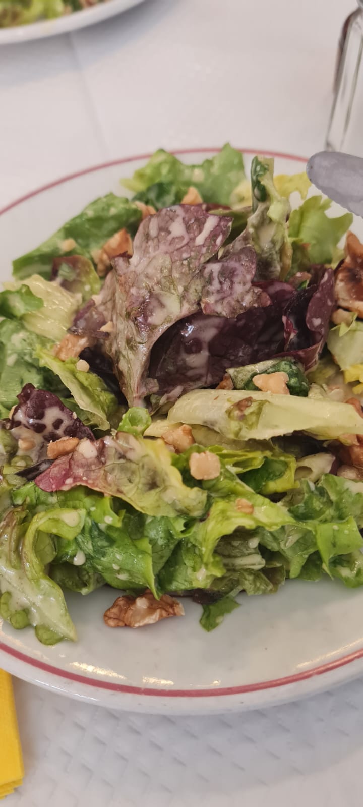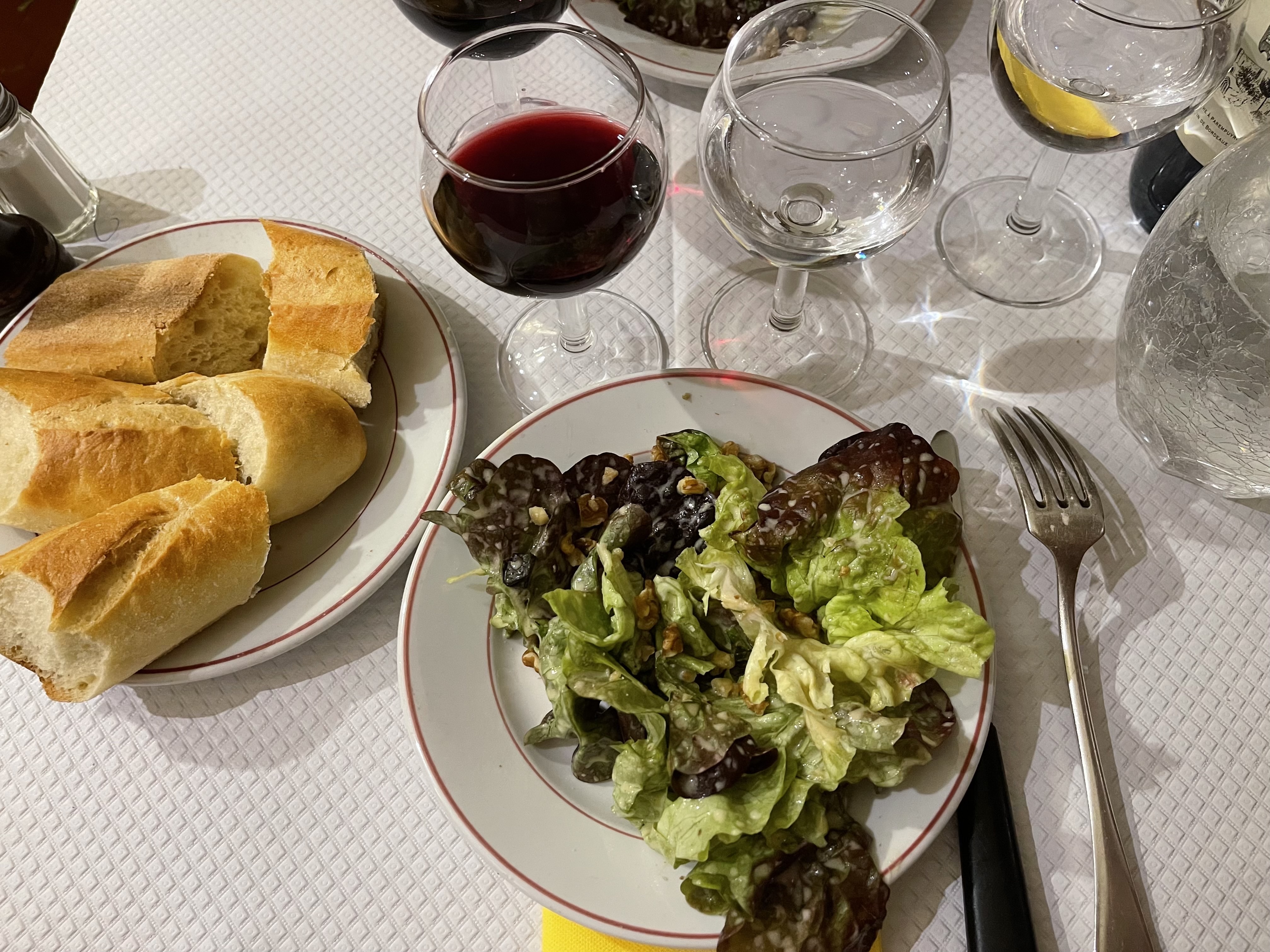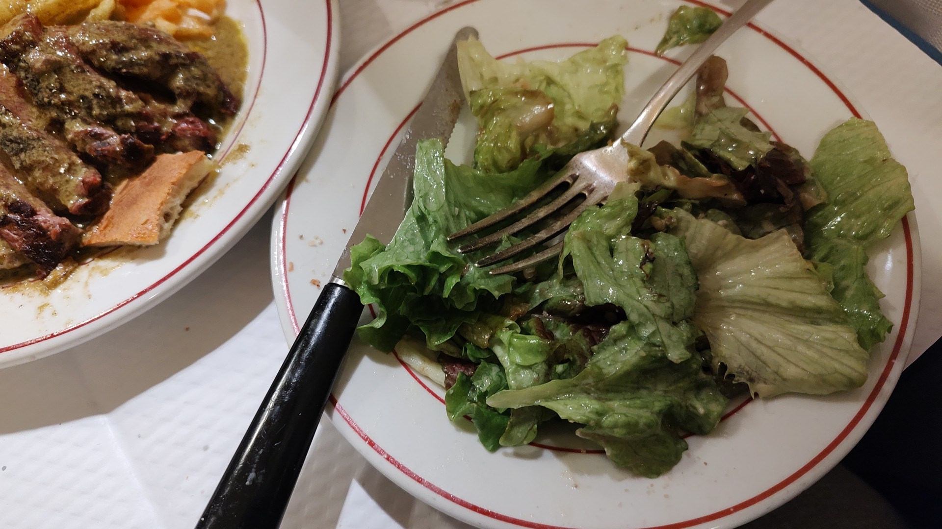La salade verte servie avec des noix semble tristounette mais ça laisse de la place au plat principal qui est l’entrecôte pommes allumettes 🥩 C’est l’unique plat du restaurant et il est servi en deux fois ! Je suis arrivée 30 min avant l’ouverture et il y avait déjà la queue, rien que pour cette sauce 🫢 Si vous êtes à plusieurs, il faut que tout le monde soit là sinon on ne vous laisse pas entrer. Entrée + plat x 2 = 28€