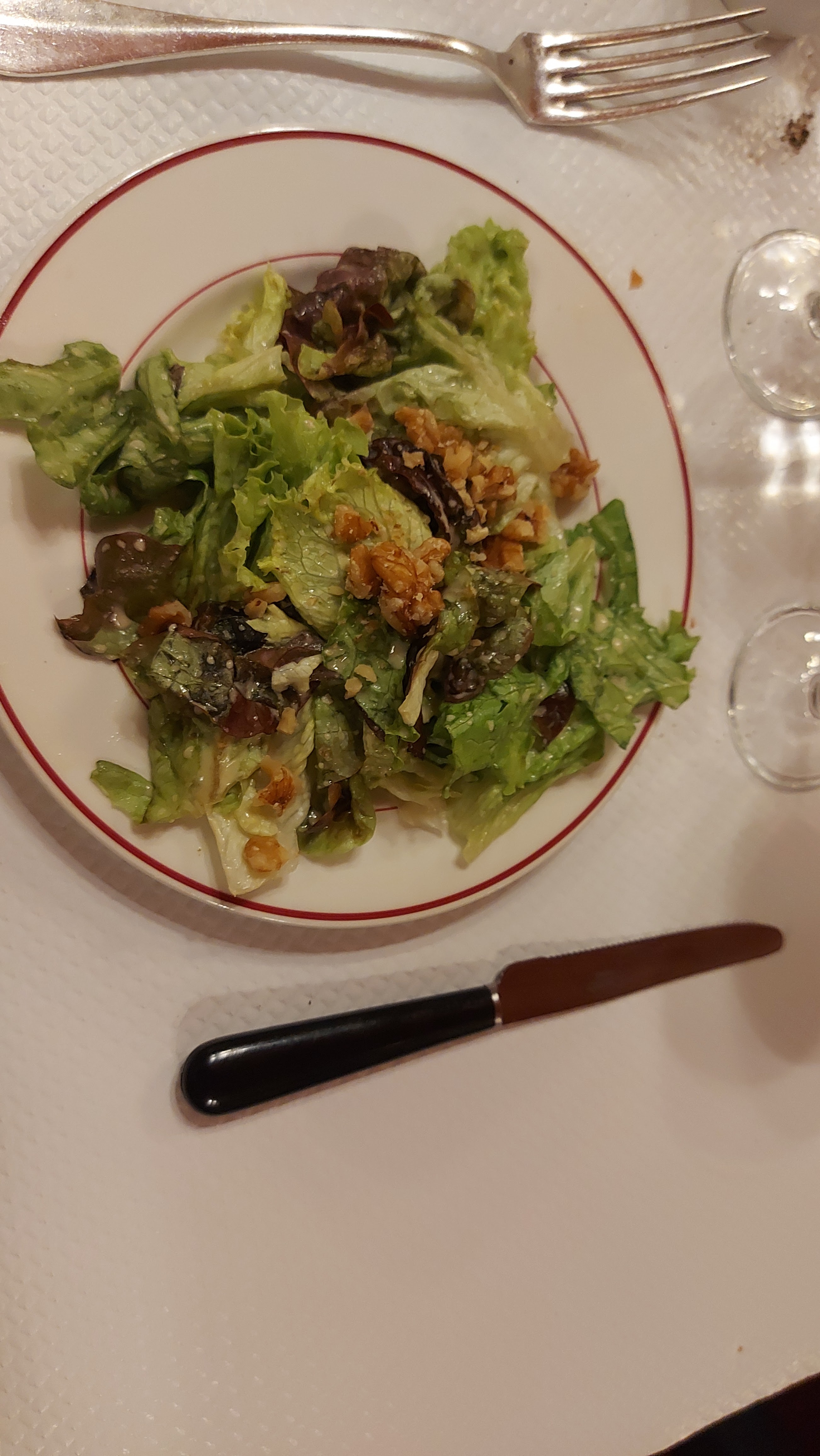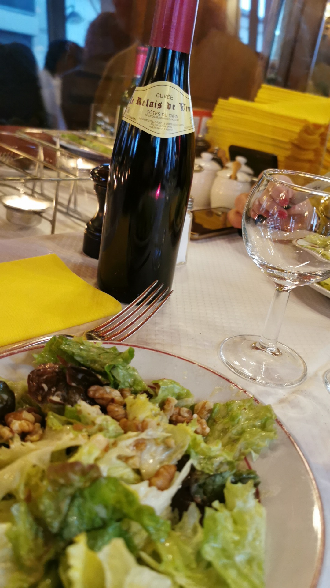 Bonne salade aux noix sauce moutarde. Bonne viande tendre et de bonne qualité. Sauce très goûteuse. Très peu de place, service expéditif et prix élevé (30€ pour une entrecôte frites).