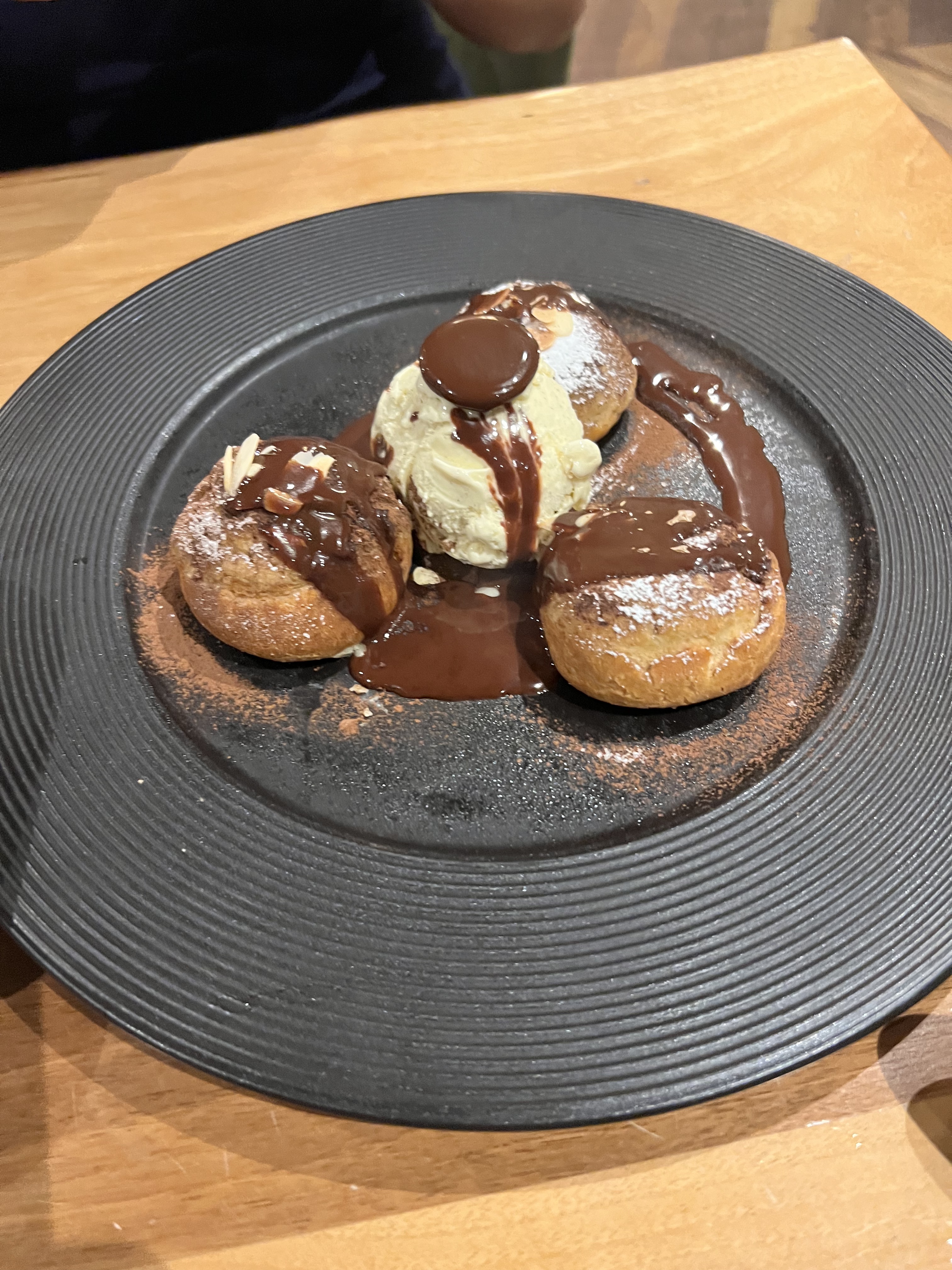 Un service irréprochable. Idem pour l ambiance. Les profiteroles sont servies avec 1 boule de glace ; 3 boules de pâte à chou ; absence de chantilly mais un récipient rempli de chocolat était présent. C'était bon mais pour 13 euros ... Je m attendais a des profiteroles moins classiques