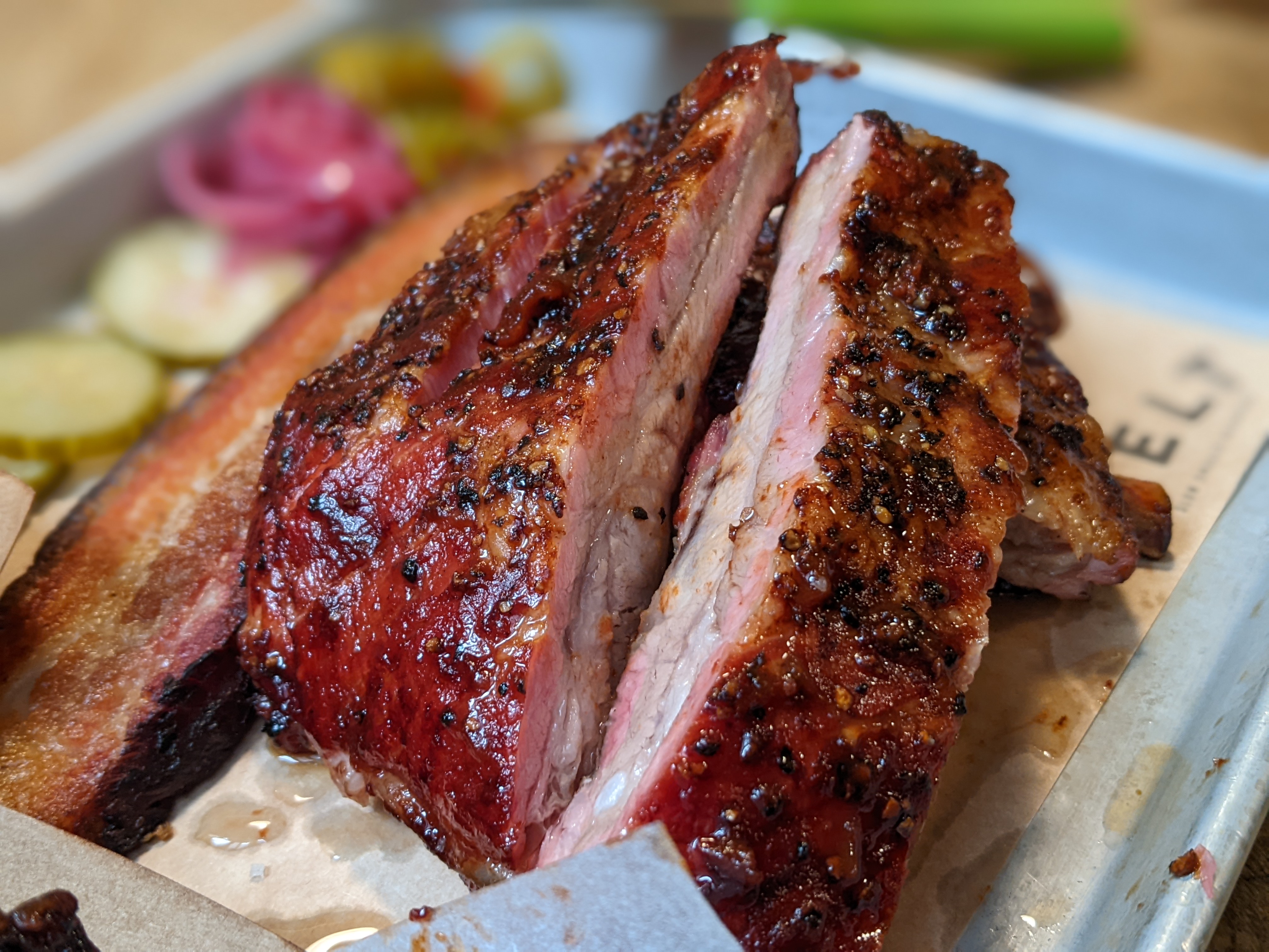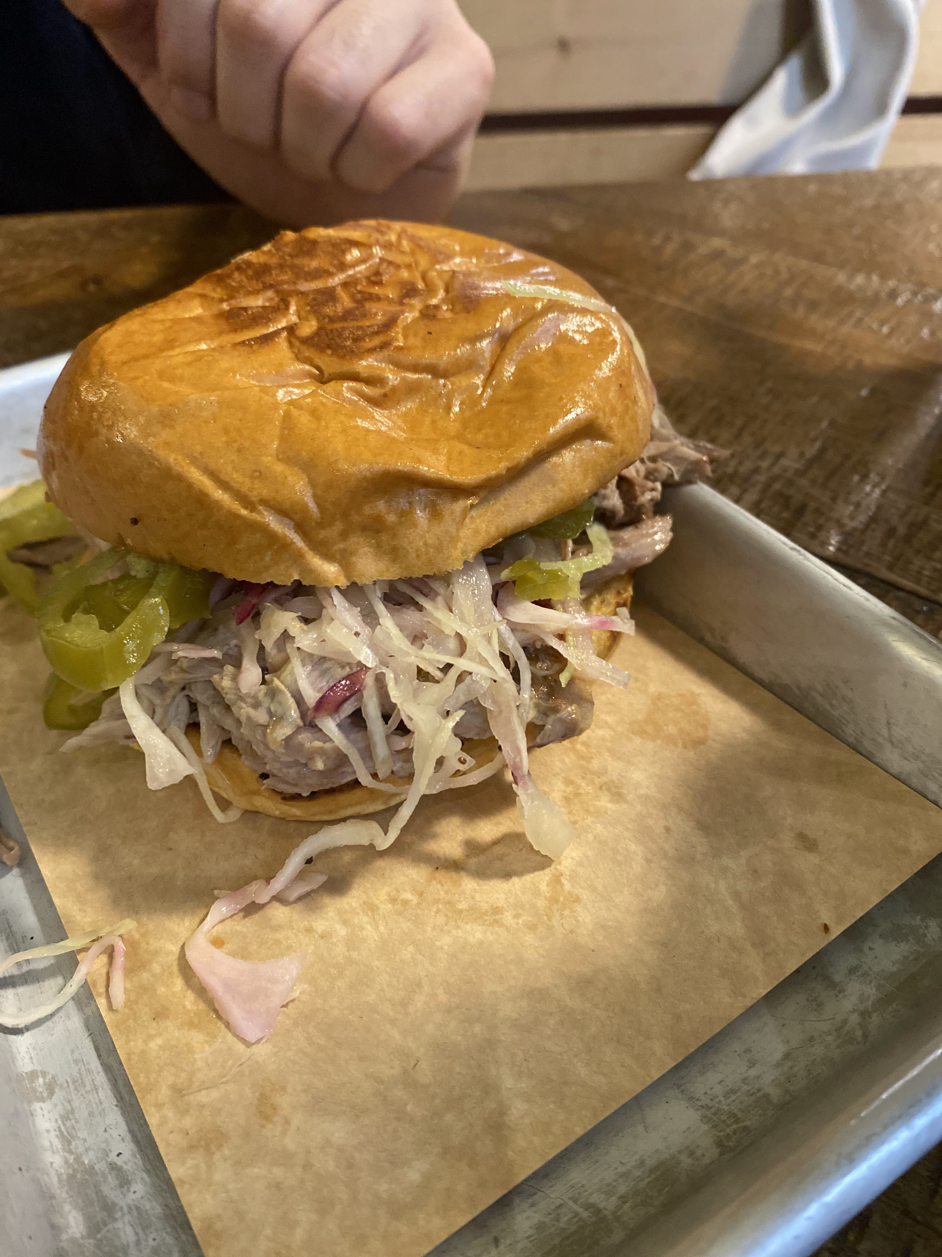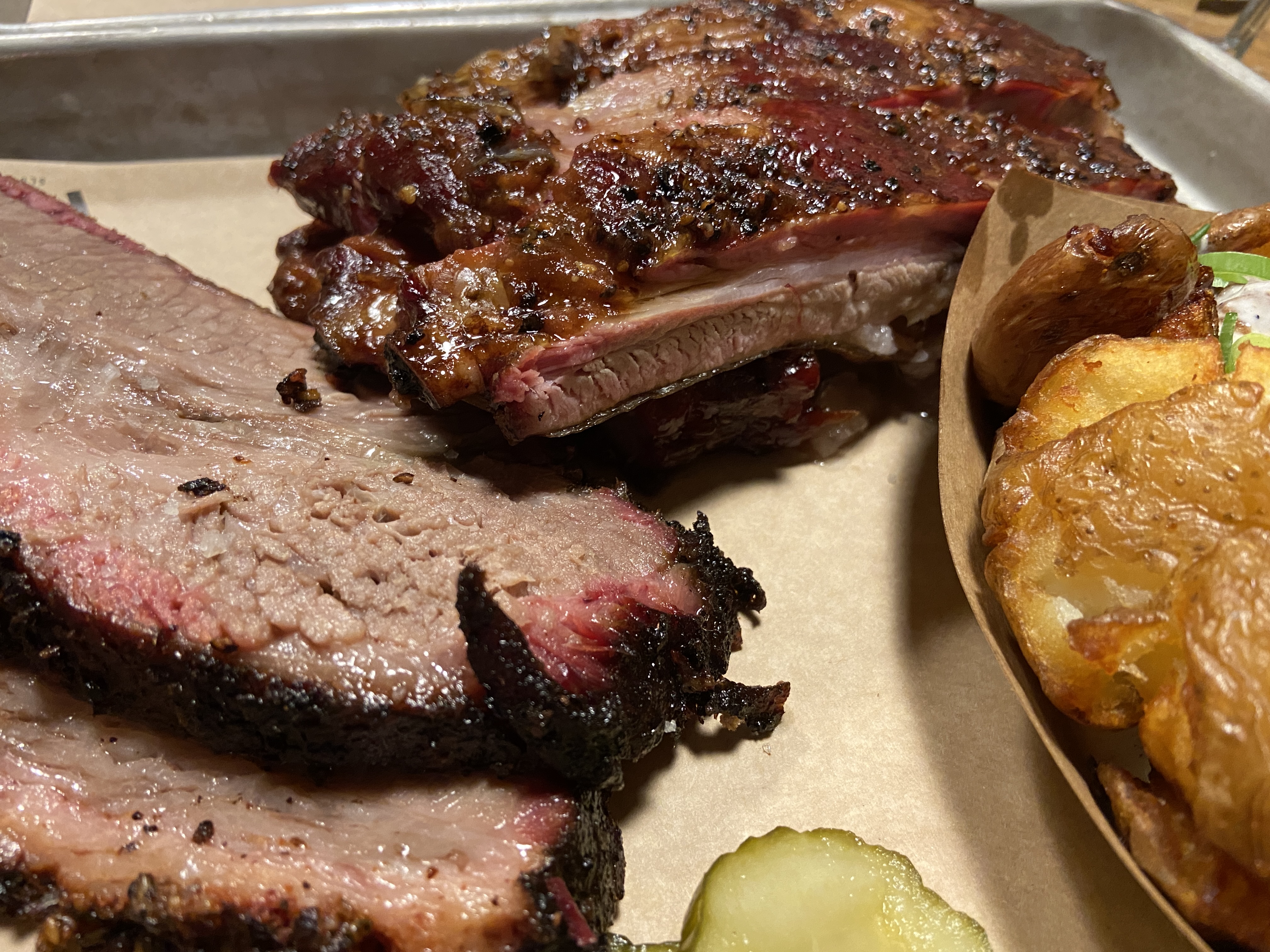 Bonne découverte. Clairement si vous êtes un amoureux de la viande. Nous avons reçu une barquette savoureuse de RIBS, pulled pork,... Je dirai même qu'il y en avait trop 😛 Nous n'avons pas pu tout finir. Juste attention avec l'excès de service, venir nous demander 4 fois si tout va bien en 1h... ça fait un peu bcp... et les tables pour 2 sont un peu petites. Mais globalement satisfait, les produits semblent être de qualité et nous y avons passé un agréable moment.