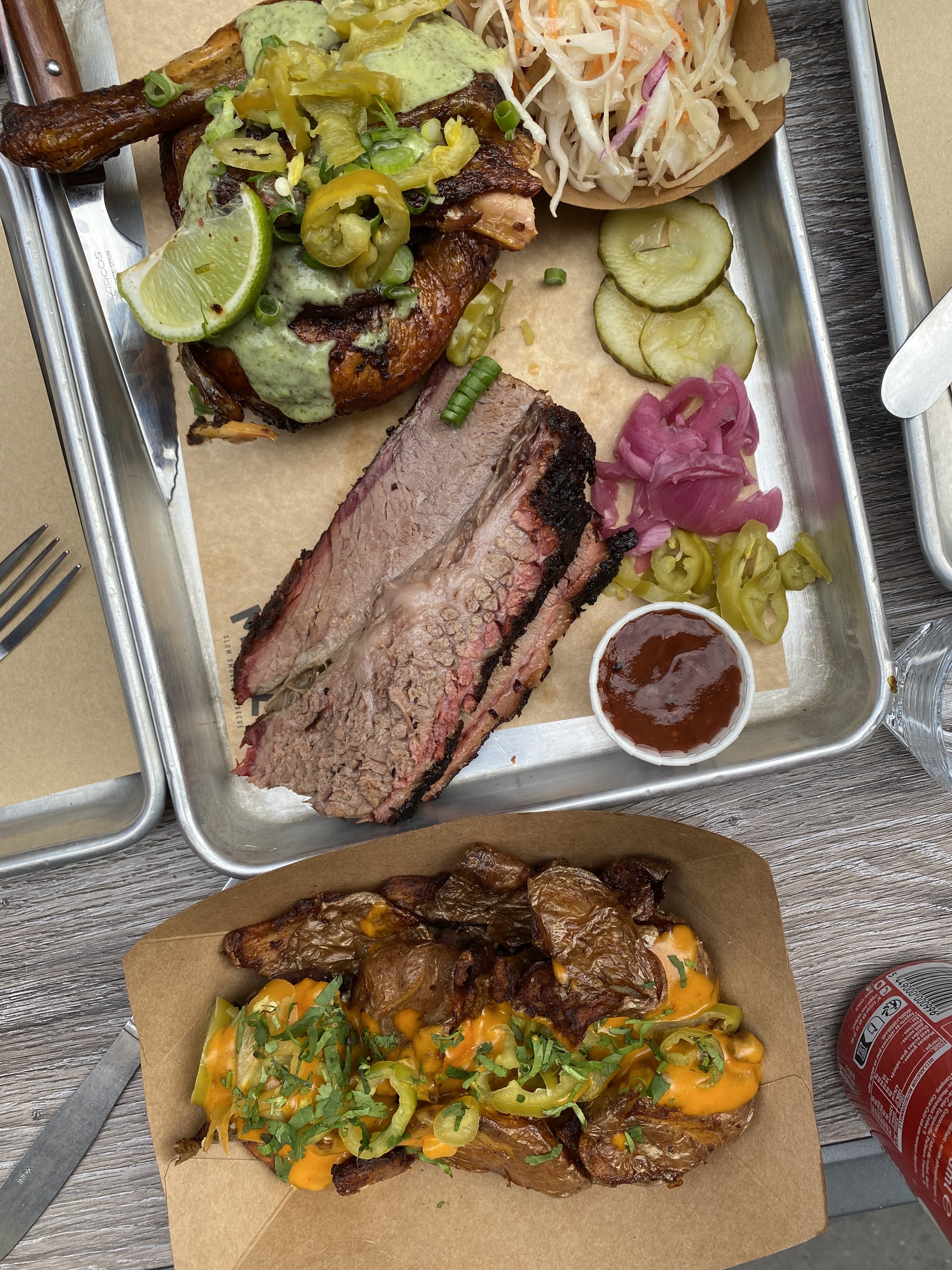 Super resto. J'y suis allé avec 2 amis, on a partagé un succulent plateau ! Tout est de bonne qualité ! Mention spéciale aux pommes de terre avec le cheddar 🥰 (Queso smash) Les cocktails étaient cools aussi ! Merci l'équipe Les seuls petites choses: -un peu plus de carottes et de sauce dans le colslaw. -Les ribs avec plus de sauce direct dessus ça serait encore meilleur !!