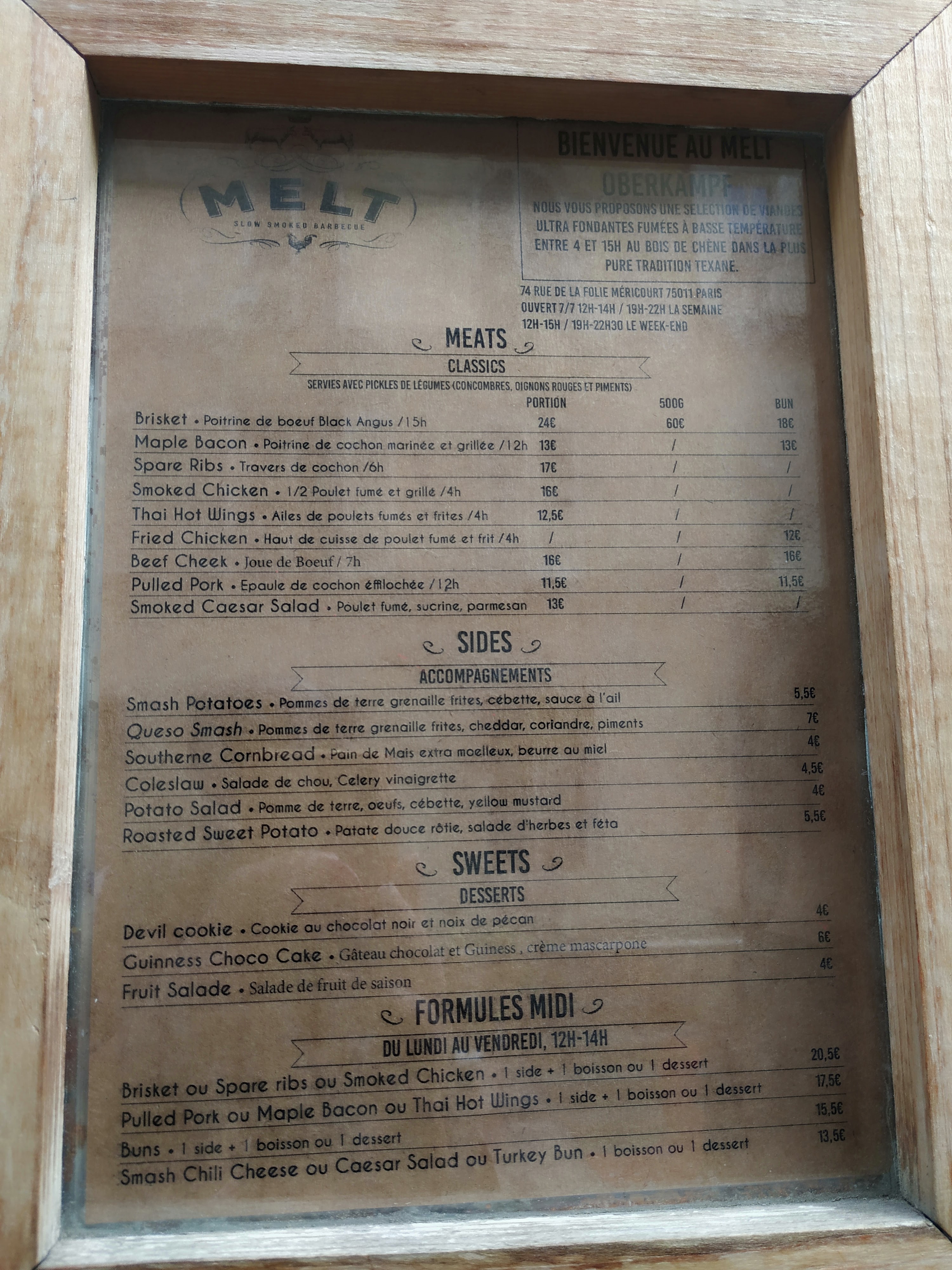 Hello Andrée iridis Eyi, Merci pour ce beau commentaire ! Nous sommes heureux de savoir que le concept de notre restaurant de viandes fumées vous ait plu ! Merci pour cette belle photo ! Nous espérons vous revoir prochainement pour que vous goûtiez le reste de notre carte, qui nous pensons va vous plaire ! À bientôt! Melt Oberkampf, Paris 11