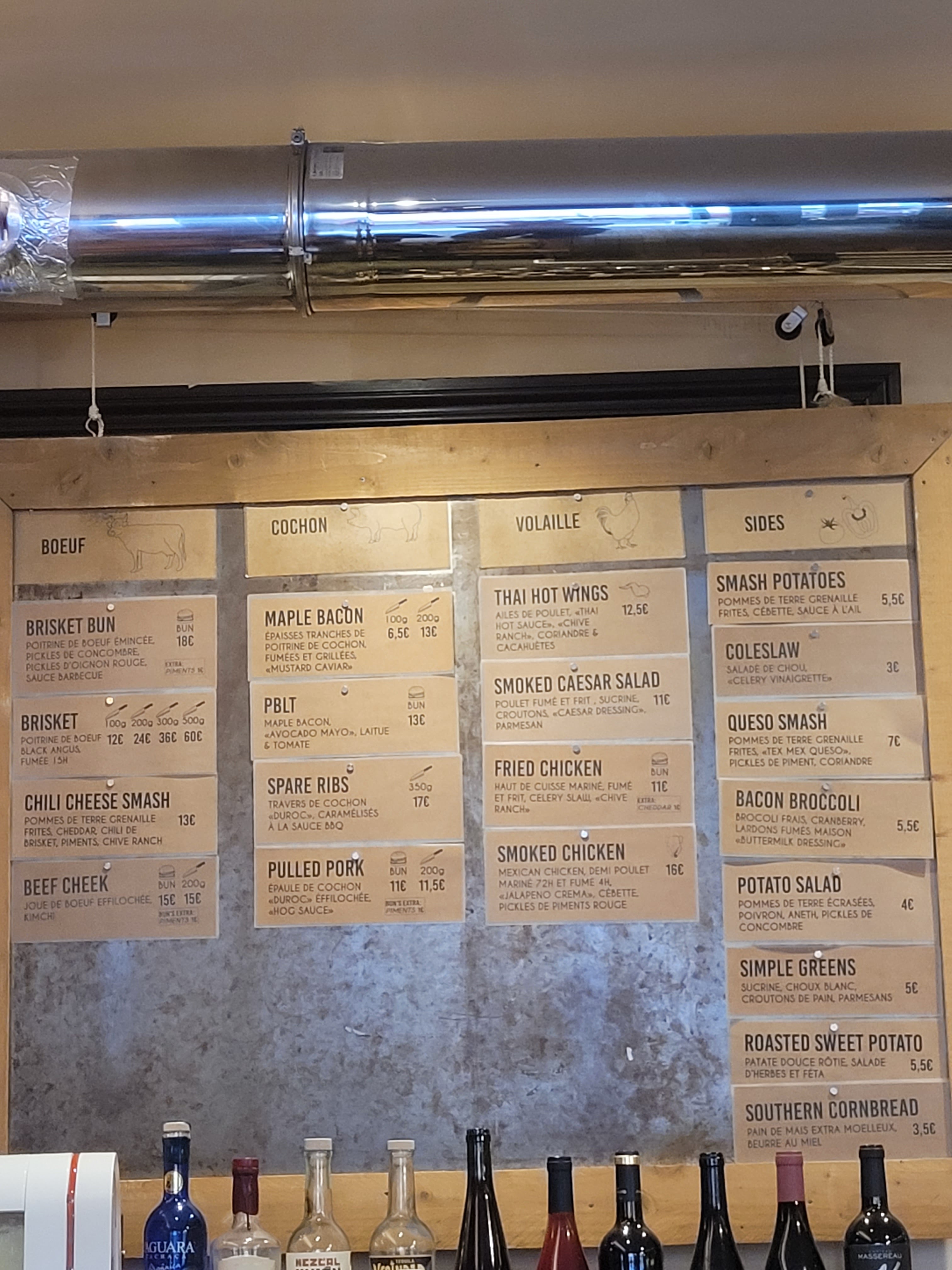 [Découverte] 🍗🍖 Un restaurant proposant des viandes fumée à l’américaine. 😍 [Repas] 🍖🍗 Nous avons pris un ribs de porc avec comme accompagnement des smash potatoes grenaille et un brisket de 200g avec potatoes salad. La viande est bien cuite et fondante rien à redire là-dessus avec la sauce barbecue sur les ribs miam. La portion est généreuse pour les ribs. Pour le brisket il nous est conseillé de prendre 200g mais je trouve que le prix est assez chère malgré tout 24€ uniquement pour le brisket sans accompagnement. Les accompagnements sont aussi bons et les portions généreuses et c’était également très bon. Les produits sont frais et fait maison. Ainsi que les sauces. Les pickles sont aussi bons avec le pickles d’oignons vinaigrés et le cornichon et les jalapeños n’était pas piquant car les graines de piment ont été retirés. Au niveau des prix cela reste élevé mais les produits sont fait maisons et la viande est bien préparé. [Service] 👍🏼 Un service agréable les serveurs sont sympas et nous explique de quoi est composé notre assiette. Les plats arrivent assez vite également. [Décor] 😀 Un décor sympa et agréable pour passer un bon moment et bien manger entre amis ou en famille. [Verdict] 🍖😍 Pour les amoureux de viande et de bbq c’est un endroit idéale. Les viandes sont bonnes et fondantes. Les accompagnements aussi. Les portions sont généreuses Je recommande d’y allé 😍🍖