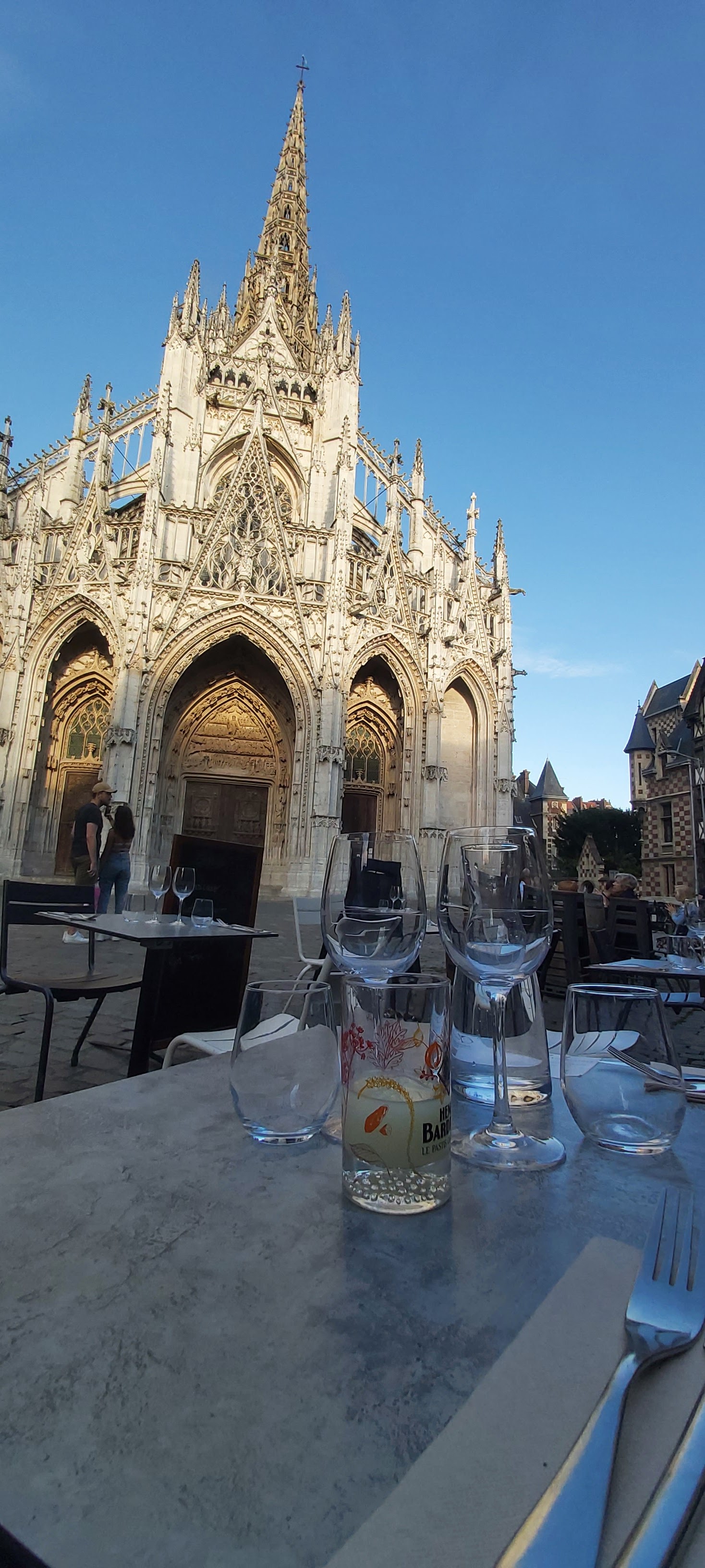 C’est bon, c’est généreux, la terrasse offre une vue incroyable sur l’église saint maclou…