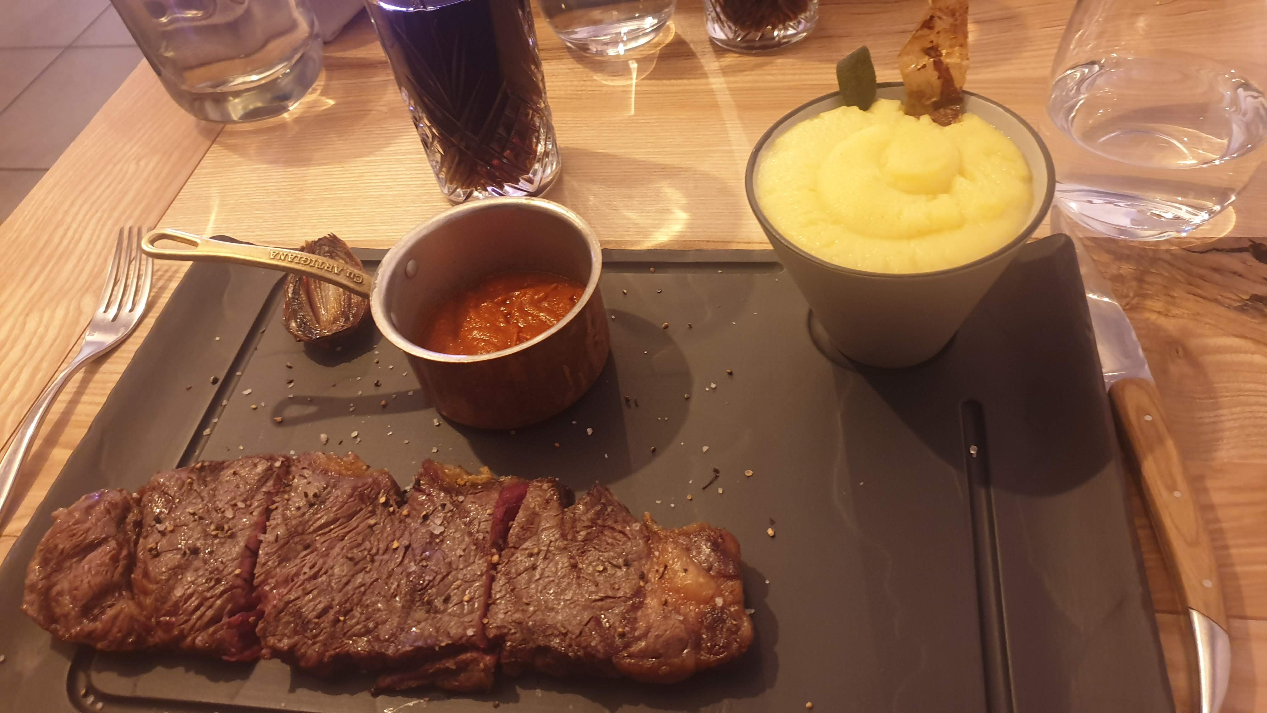 Je dirai que je suis mitigé. C’était ma première fois, j’en avais tellement entendu parler que je m’étais fait une montagne. En positif : L’équipe est sympa, le resto est sympa. Le plat est copieux. Un large choix de viande et une carte des vins impressionnante. En négatif : Évidemment, LE point noir, mais on le savait avant d’y aller, c’est le prix. Vous vous faites éclater. Après, j’ai été plutôt déçu de mon plat, on a pris une côte de bœuf (photo) à 159 € / kg, et déçu finalement par rapport au prix. On était 9, on s’en est mis pour + de 1300 € et les digestifs (4 genépis) n’ont pas étés offerts… pas très commerçant En conclusion, je suis content de l’avoir fait, mais c’était ma première et dernière fois.